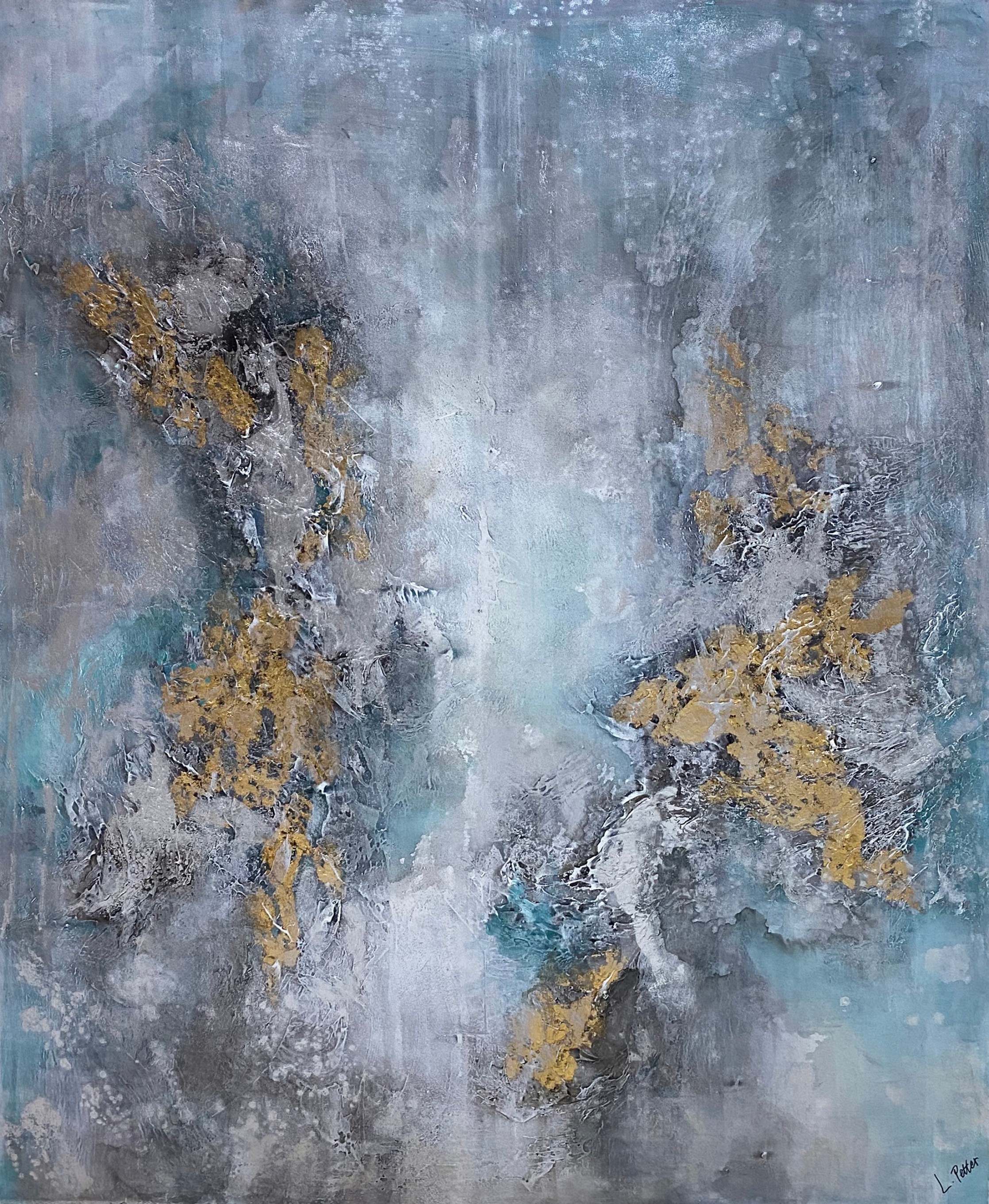 Layers of blue wash across the surface, intersected by earthy strokes and fine linear traces. The composition evokes water, sky, and shifting reflections, where clarity and obscurity meet. Le’s palette transforms coolness into emotion, turning the canvas into a meditation on memory and atmosphere.